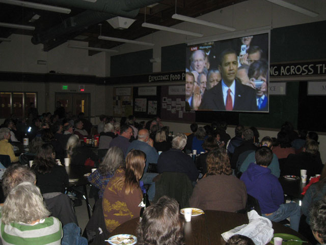 Last night, over 125 people collected at the FHHS Dining Hall for the Progressive Potluck, a dinner that was open to all islanders to see the replay of the Inaguration on the big screen.