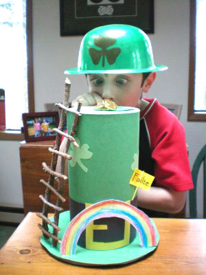 This weekend, Liam constructed a Leprechaun Trap for his 2nd grade class. He and his classmates put the traps out yesterday in hopes that they would catch themselves some lucky leprechauns on St. Patrick’s Day. In the past, the only evidence in Ms. Evan’s classroom were little leprechaun footprints on the special day. Liam hopes that a leprechaun will climb the ladder onto the top of the hat to get the gold and will fall through the top into the pile of cotton inside. His sign, “Failte” is Gaelic for “Welcome.” Between the sign, the rainbow and the gold, we think there is enough to attract a lucky leprechaun.