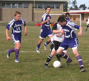 Friday Harbor scored a couple of minutes into the second half (Conor Lanphere finished a Cameron Byington cross to the right side) to offer a sign of things to come as the Wolverines work to pull it together tomorrow when Meridian comes visiting. Despite the score, our guys were still working hard (that’s sophomore defender Mathew Skeels protecting the ball) late in the game, still looking to score one last goal.