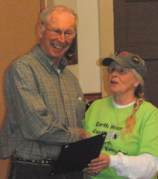 You heard that next Saturday is when the worldwide Earth Hour happens, right? It’s local (the Town Council just affirmed it) and it’s global – here’s more from Jeanne, shown with Friday Harbor Mayor David Jones: