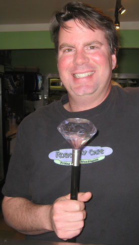 I checked in about how the Mr. San Juan contest at the Roche Harbor Pavillion went, and there are four things to report: John Sable (photo, at Rocky Bay Sunday, with the sceptre you get for being king) won the coveted title; the fundrasier made some $8600 for the Friday Harbor PTA (which means: for the kids); and that everyone had a great time in the event emceed by Boo Boo. Way to go!
