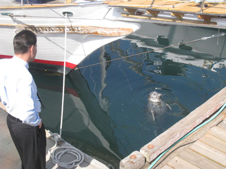 On Sunday, walking down on the docks, Josie & I saw some tourists watching Popeye the resident harbor seal, as she was splashing people & stuff… one of ’em said, “That’s Popeye, he’s a harp seal.” Oh.
