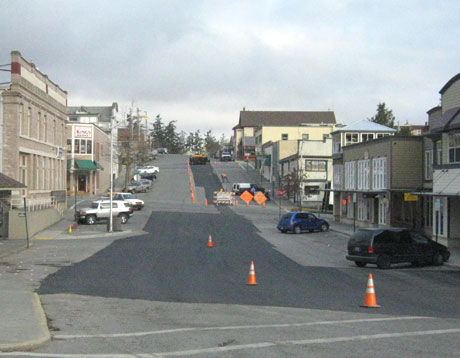 That’s the view up First Street in Friday Harbor on Thursday, looking towards the Whale Museum from the ferry lines as Town crews help re-pave the street as part of the sewer project. Might have to go around the block today to get around all this, but the new road will be smoother afterwards.