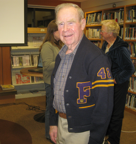 It was great to hear how the collection of stories is going with the Historical Museum & the Library… on Friday night director Laura Tretter gave an update about how the digitalizing is going, and showed everyone how to look up stuff online. Then museum director Kevin Loftus introduced folks with their stories, including FHHS grad Al Nash (’42) who showed his letter sweater from his two years of playing basketball, which was the only sport we had then. You’ll remember he came back from WWII & got the drug store going – but that’s another story.