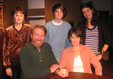 The cast of "Rabbit Hole": In back, from left: Ann Cozzalio, Will Tranfo, Carolyn Marie Monroe. In front: Dan Mayes and Krista Strutz. (Photo by Ian Byington)
