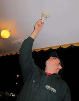 • Keeping the street brightly lit – that’s Aaron at the Palace Theatre replacing a couple of bulbs in front of the movie house. I had never noticed how many lights there are in that stretch – check it out! And … Aaron says the Sandy Bullock movie “The Blind Side” and “The Twilight Saga: New Moon” will be here next week as well as this week.