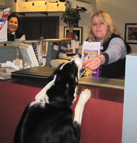 That’s my friend & occasional office dog Tucker getting a treat from Liz at the post office yesterday…he’s good at licking stamps, too.