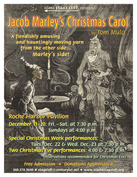 The play was a hit last December, so Island Stage Left is bringing Jacob Marley’s Christmas Carol back this week. Last year’s show suffered the worst of turns when Dan Mayes had heart troubles near the end of the run, but he’s OK now & back!